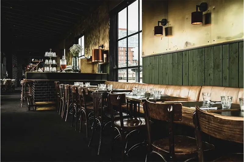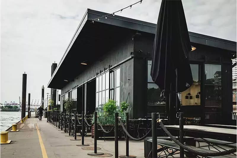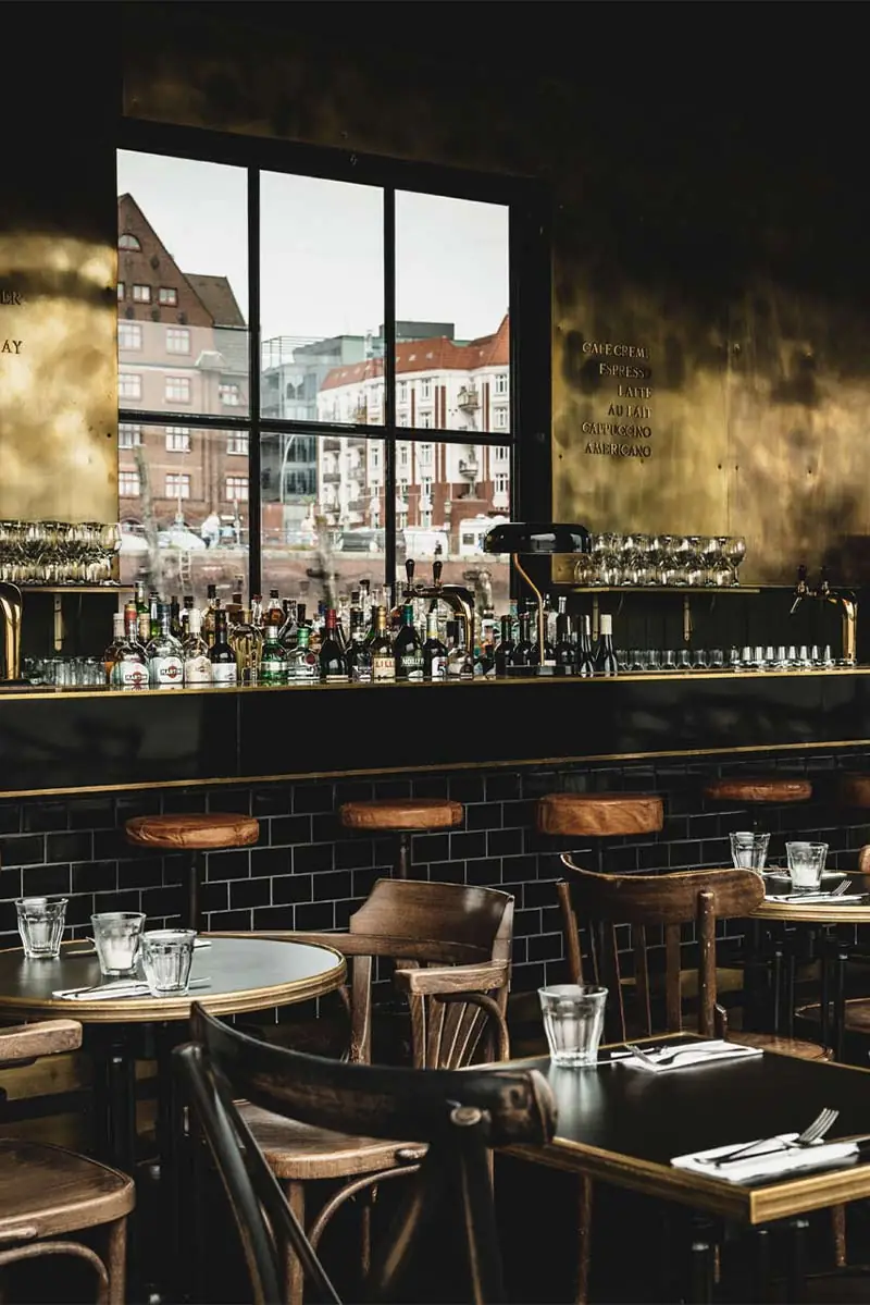 LIBERTÉ has its permanent home mooring where fishermen used to tout their freshly caught goods directly from their boats. A floating yet tranquil design object made of wood and steel with large sliding glass doors – reminiscent of the gates of the old harbor warehouses. Inside, too, the LIBERTÉ is a fascinating overall composition with numerous details: black walls and tiles, elegant brass plates and leather benches, as well as charming bistro furniture and finely curated accessories create an extraordinary maritime atmosphere.