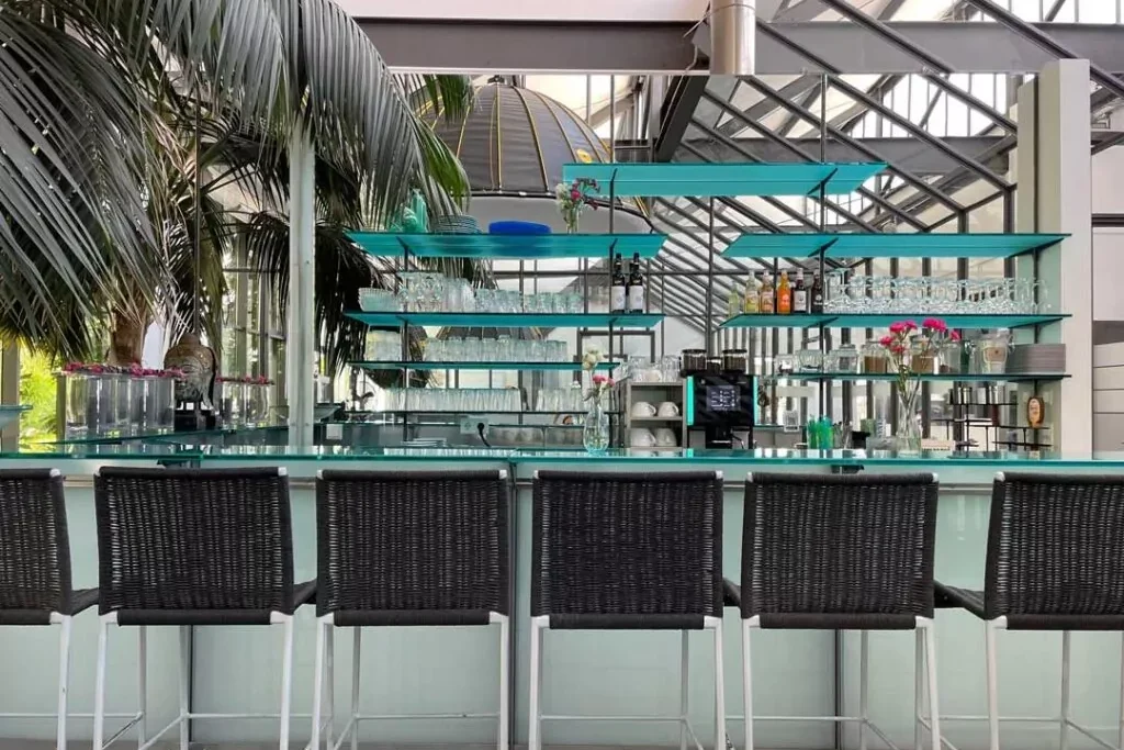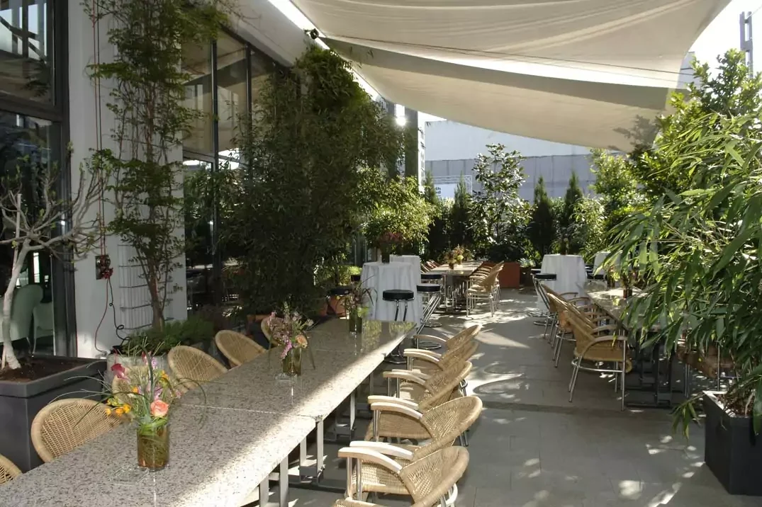 The studio has gray flooring and a total area of 200 square meters. A small separate area is perfect for use as a back office for catering.