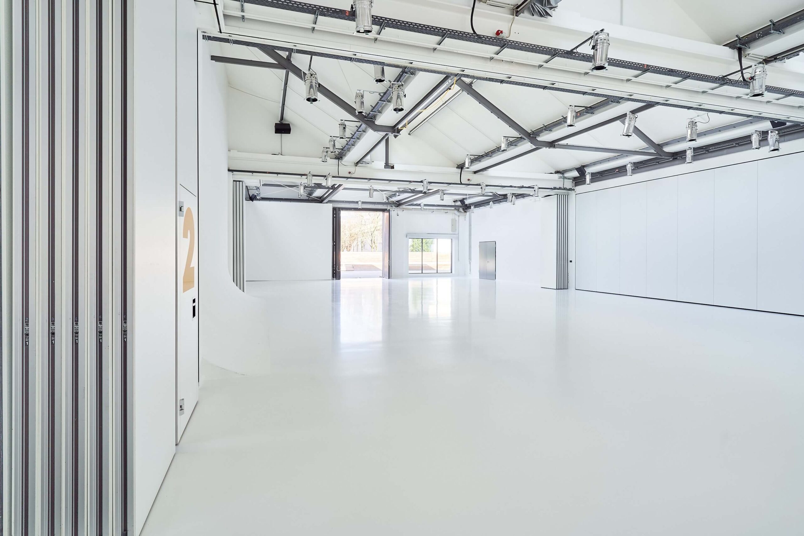The studio is located directly next to the parking lot. It has a large exterior door with a width of 3.20 m. The studio area measures 150 square meters.
