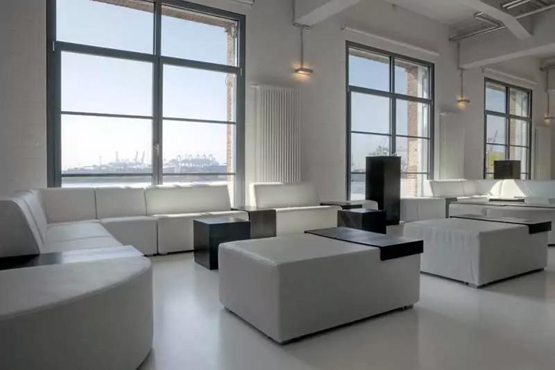 And to avoid city traffic, why not shuttle your guests to the nearby pier in true Hanseatic style? Up to 350 people can enjoy events of all kinds here. A sound system, projector, and LED spotlights with color-changing technology are integrated into the location.